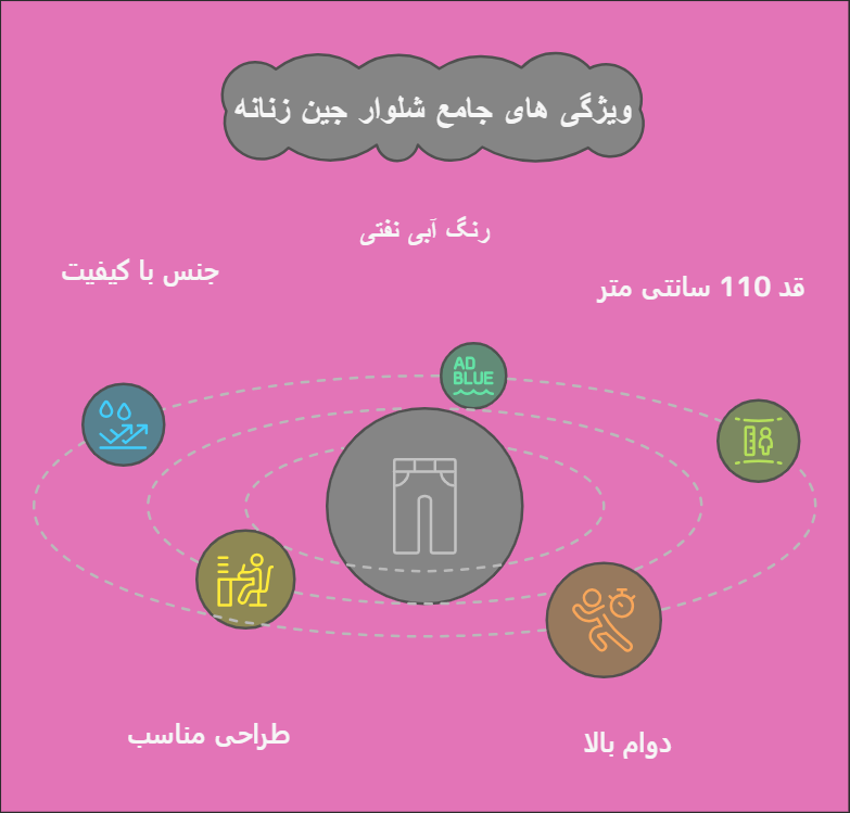 شلوار جین زنانه تمامی آپشن هایی از قبیل رنگ آبی نفتی، طراحی مینیمال، قد 110 سانتی متر را که یک محصول را چند منظوره می کند، را دارد. با استفاده از این ویژگی ها شما می توانید استایل های متعددی برای خود ایجاد نمایید و با لباس هایی چون بلوز، تیشرت و … به تیپ مورد نظر خود دست یابید و برای اموری چون خرید رفتن، گشت و گذار، مکان های غیر رسمی بپردازید.